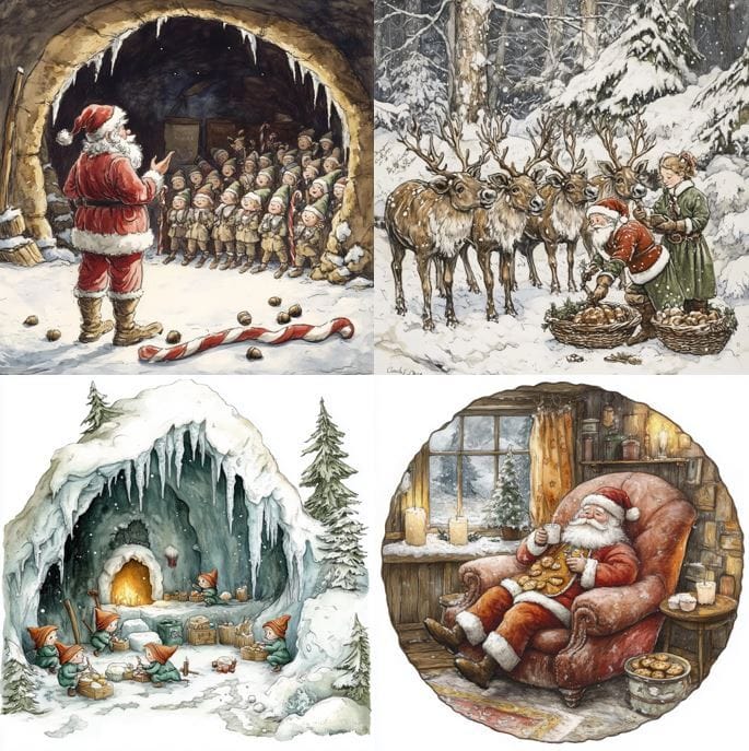 Salmontunabear’s Beatrix Potter-inspired Christmas final preps using Midjourney.