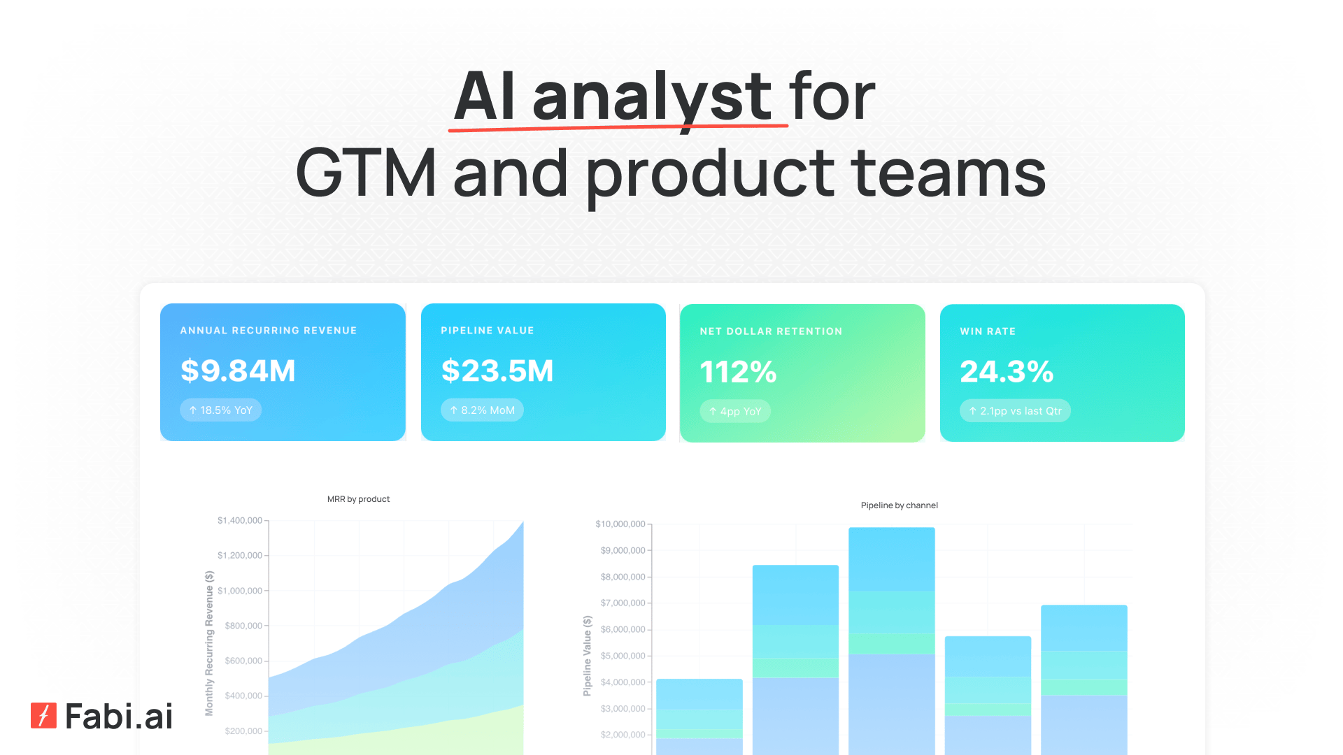 Fabi connects your entire stack and lets you ask plain-English questions. Which features drive retention? Where are users dropping off? You get answers, charts, and full dashboards in minutes. Just describe what you want and Fabi builds it.
