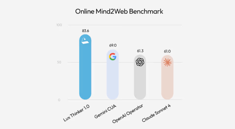 Lux achieved an 83.6 percent success rate on the Online-Mind2Web benchmark, outperforming OpenAI’s Operator at 61.3 percent and Anthropic’s Claude Computer Use at 56.3 percent.