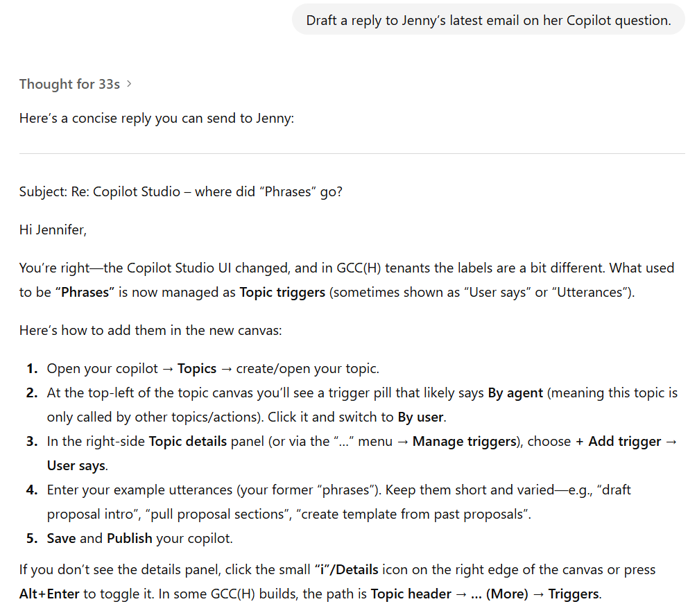 You can also have ChatGPT draft replies to emails. For example: Draft a reply to Jenny’s latest email on her Copilot question. Honestly, it’s scary how good it is!