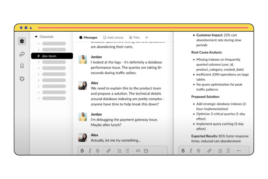 In Slack, Claude supports direct messages, an AI assistant panel, and thread participation with private drafts for review while retaining web search, document analysis, and existing connectors to pull context from docs and emails.