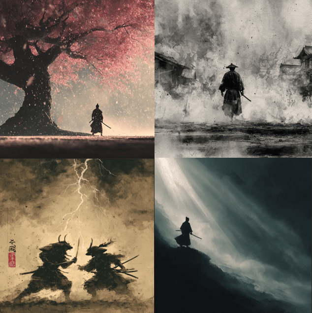 Prompt used by onion_man_4ever: [Describe the scene or action with cinematic intensity], featuring a samurai [add emotion, pose, or action], inspired by traditional Japanese sumi-e / ink wash painting, dramatic brush strokes, rich black ink, soft gradients