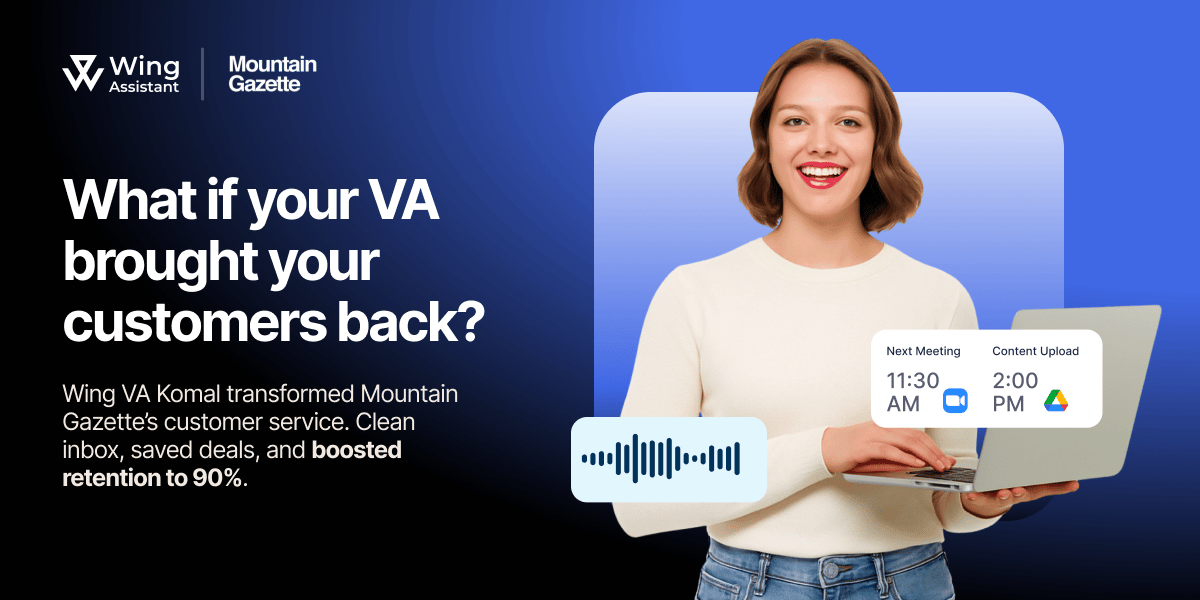 Mike didn’t expect his Wing VA, Komal to become the voice of his company, Mountain Gazette. But within weeks, subscribers were writing back just to say how friendly and helpful she was.