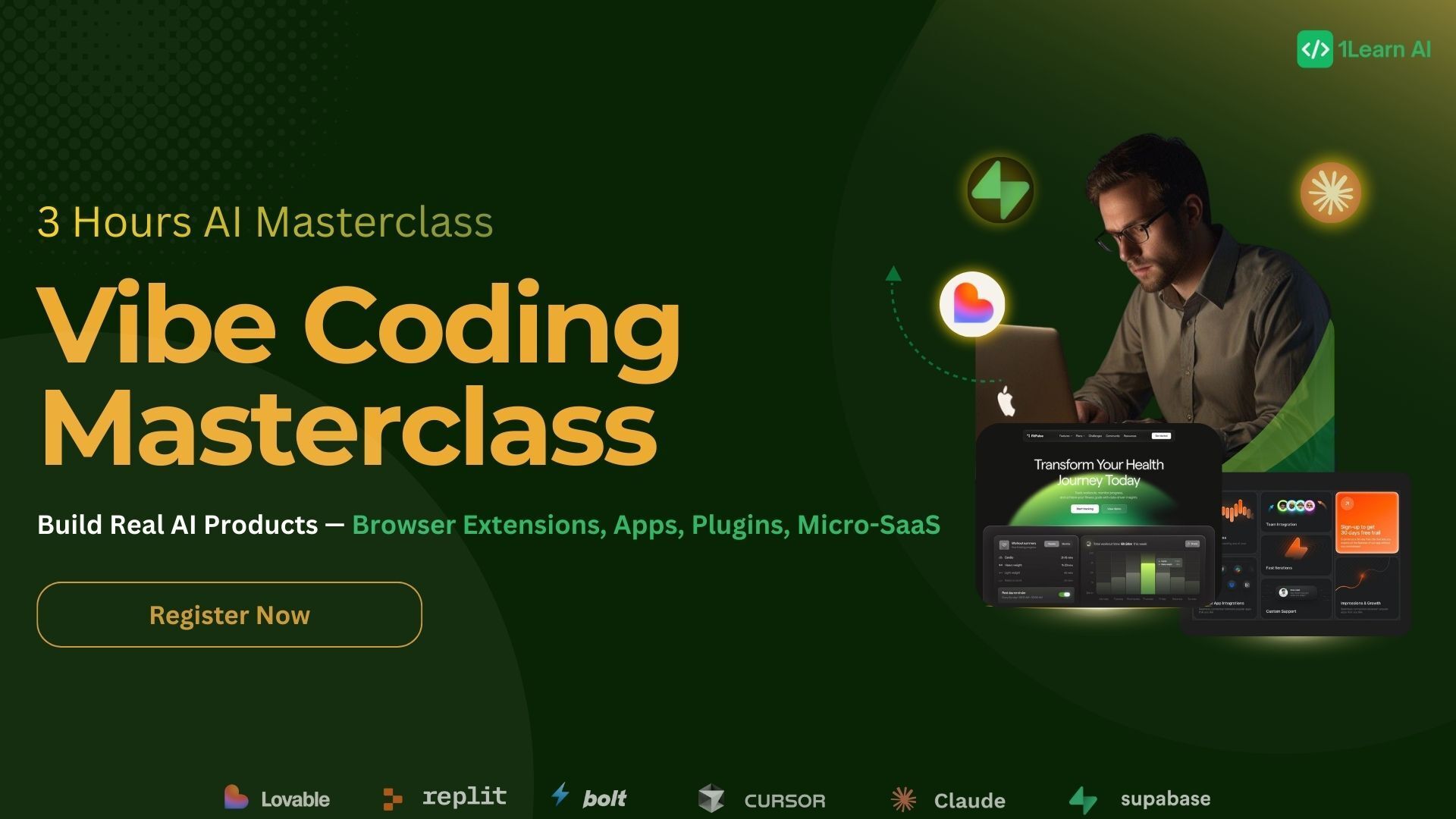 In this 3-hour Masterclass, you’ll learn how to turn your ideas into fully working apps using the most powerful AI tools — Lovable, Bolt, Cursor, Replit, Claude, Supabase and more.