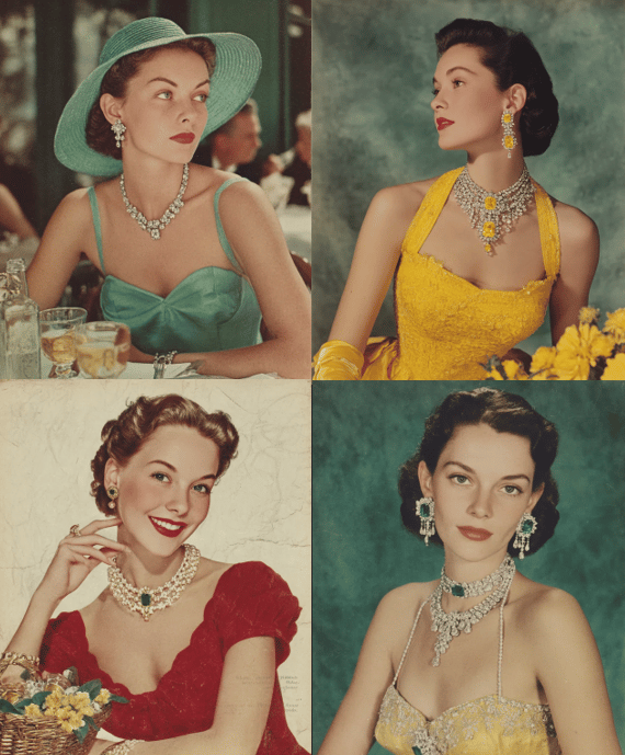 1950 advertising for high end jewelry, aquamarine, light blue, smiling --ar 5:6 --stylize 200